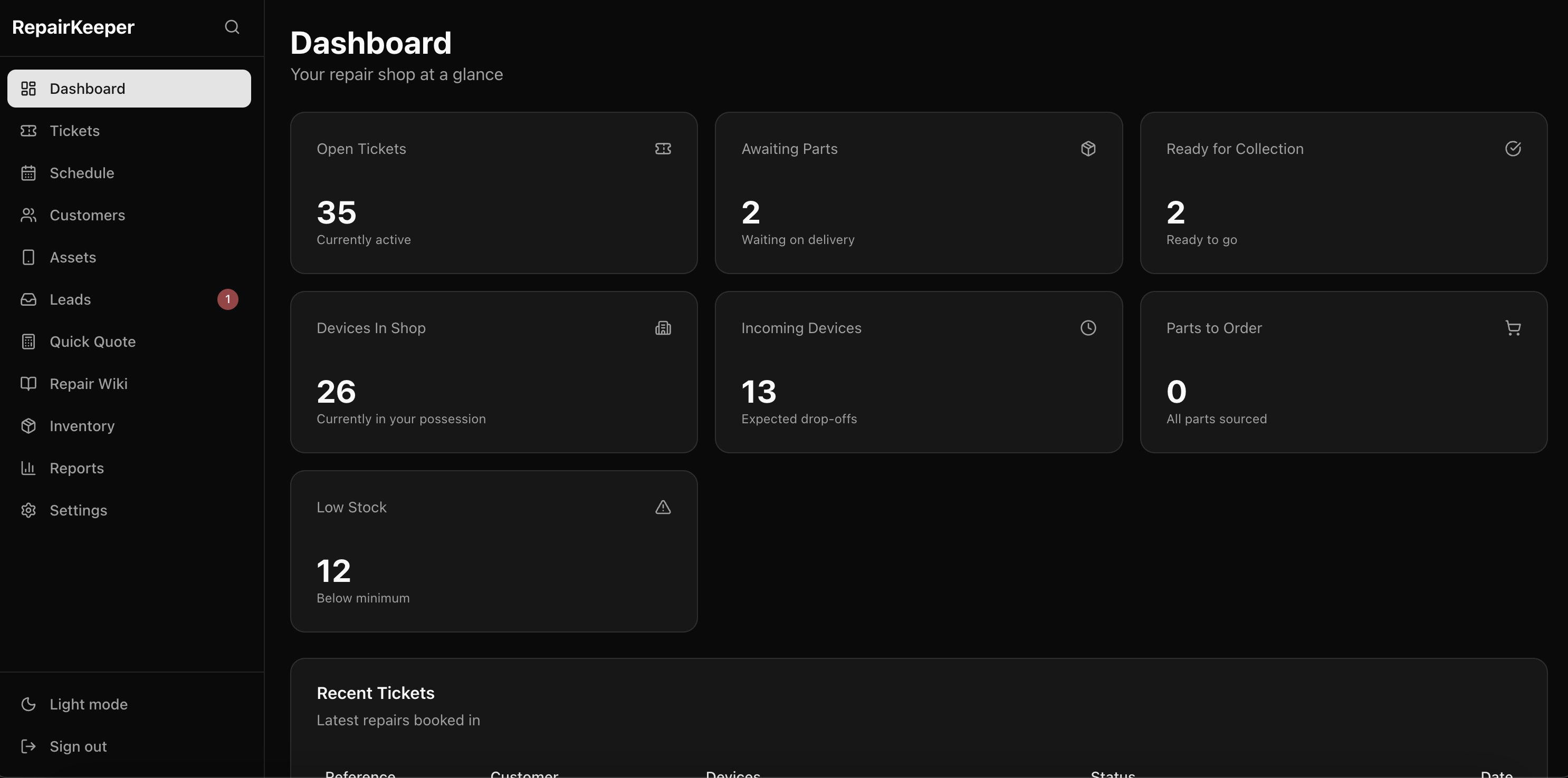 RepairKeeper is the only platform with true multi-device tickets (one ticket, multiple devices, each tracked independently), an intelligent auto-status engine that moves tickets forward automatically, and a shared global repair wiki. Plus features like passkey login, customer duplicate detection, and a full audit trail.